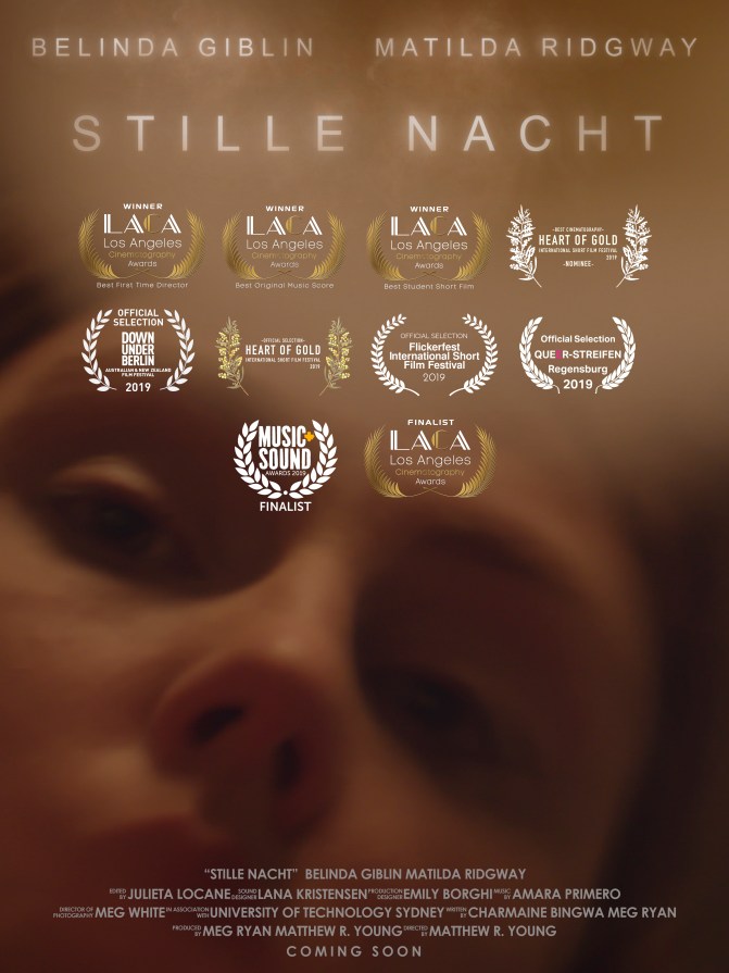 award-winning director, producer and writer of STILLE NACHT (2019), distributed by SBS on Demand, screened at Flickerfest, Down Under Berlin, Heart of Gold International Short Film Festival & more. Nominated for 11 awards, won five including Best LGBT Film, Best Student Short Film & Best First Time Director.